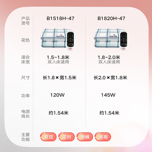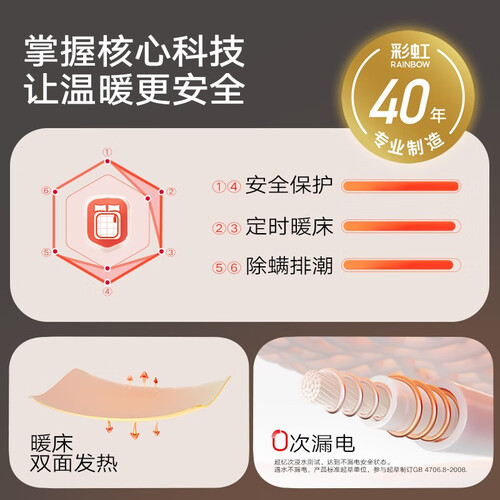 彩虹(RAINBOW)电热毯双人电褥子双控长2.0/1.8m排潮定时除螨自动断电暖床电毯子 定时除螨双控长2.0米*宽1.8米无纺布