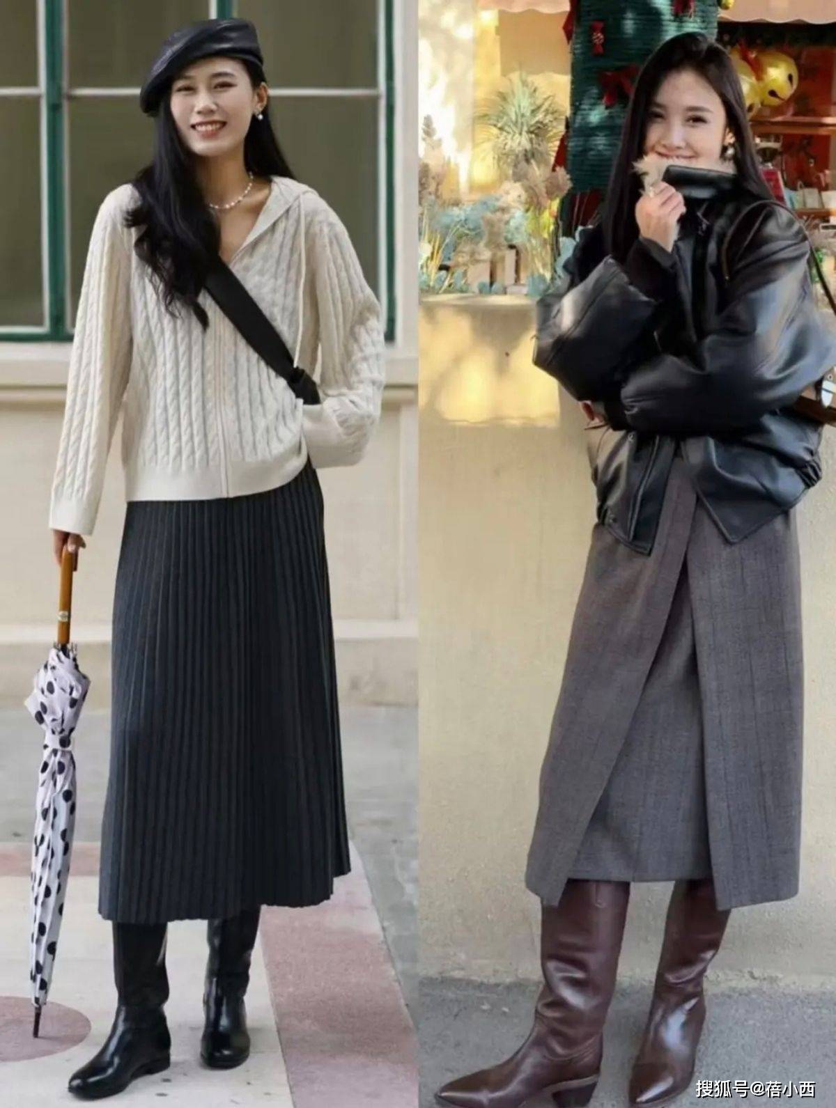 不管是梨形身材、微胖身材,还是腿型不直的女生,都能靠“裙子+靴子”找到适合自己的搭配,比如穿长裙能遮住胯部和大腿的肉肉,修饰下半身线条,搭配挺括的长筒靴,进一步显得整个人纤细匀称。