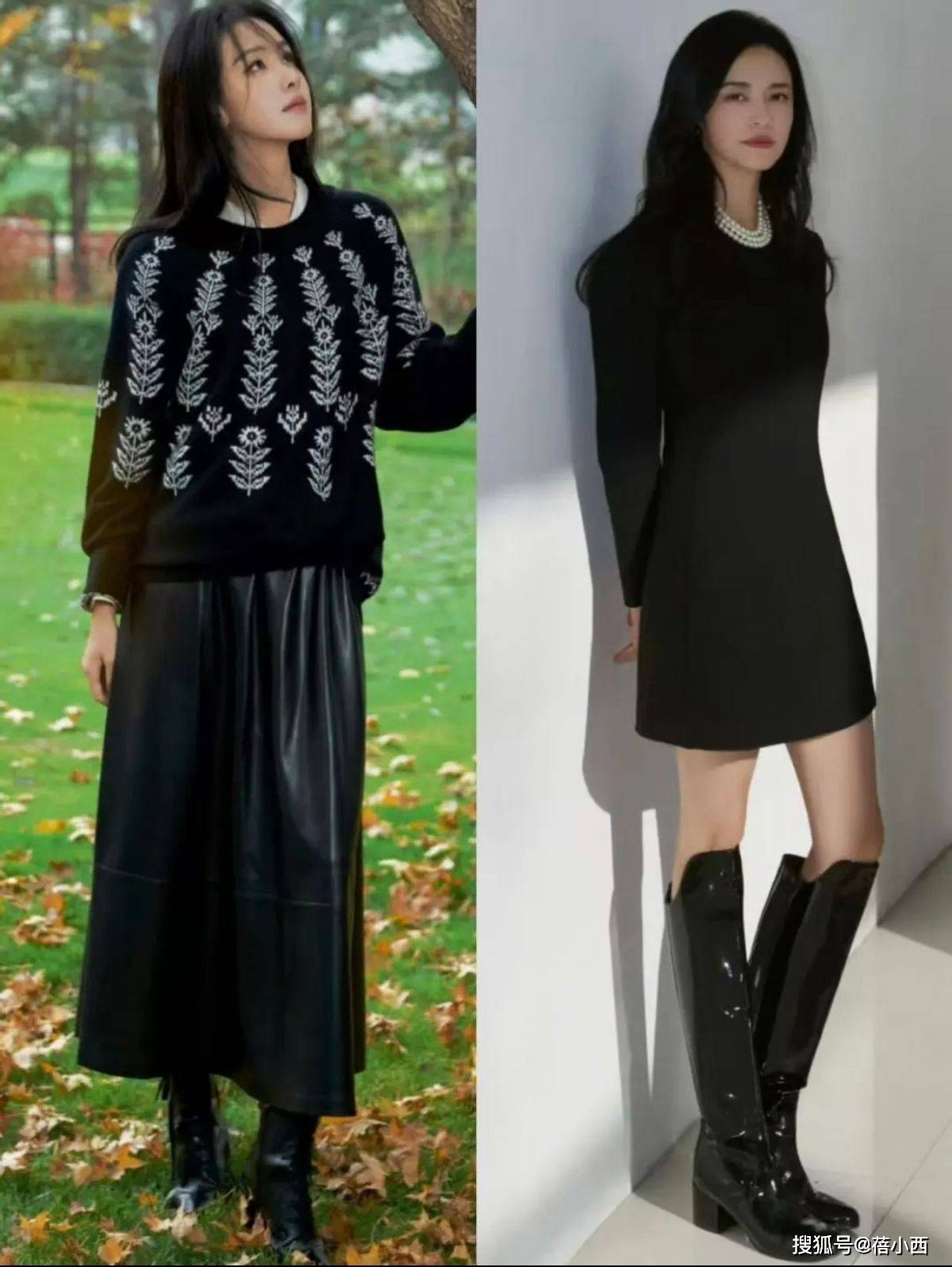 黑色长靴可是冬日显瘦神器,靴筒包裹小腿和脚踝,能有效修饰腿型,拉长腿部比例。搭配一件毛呢大衣和伞裙,整体可以形成流畅的线条感,端庄又显高,腿型不直、腿粗的女生闭眼冲。