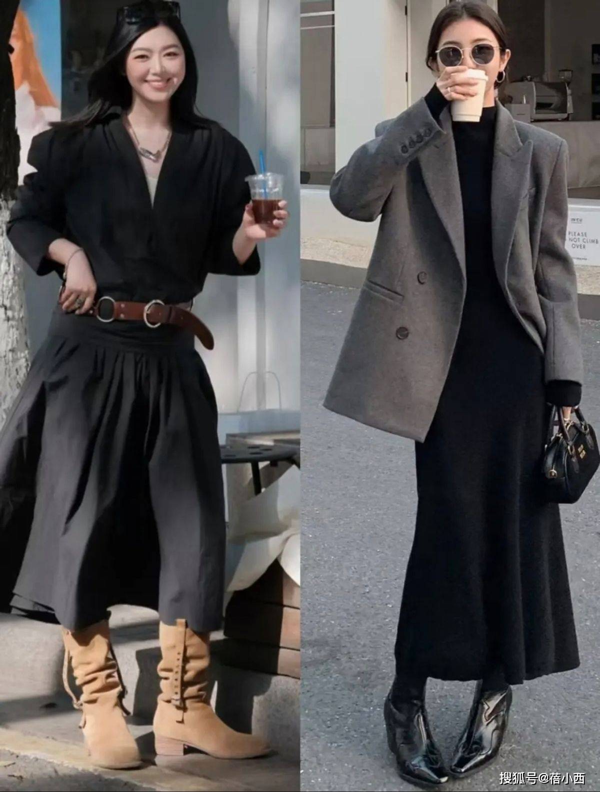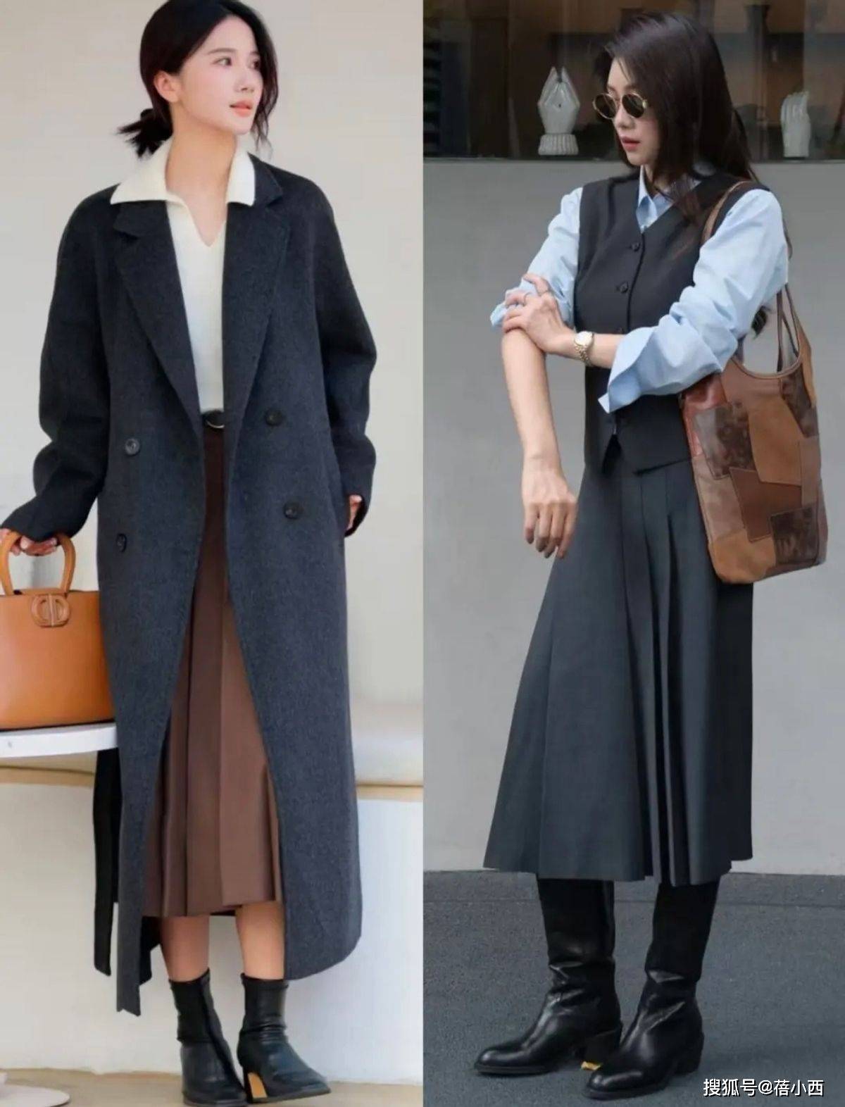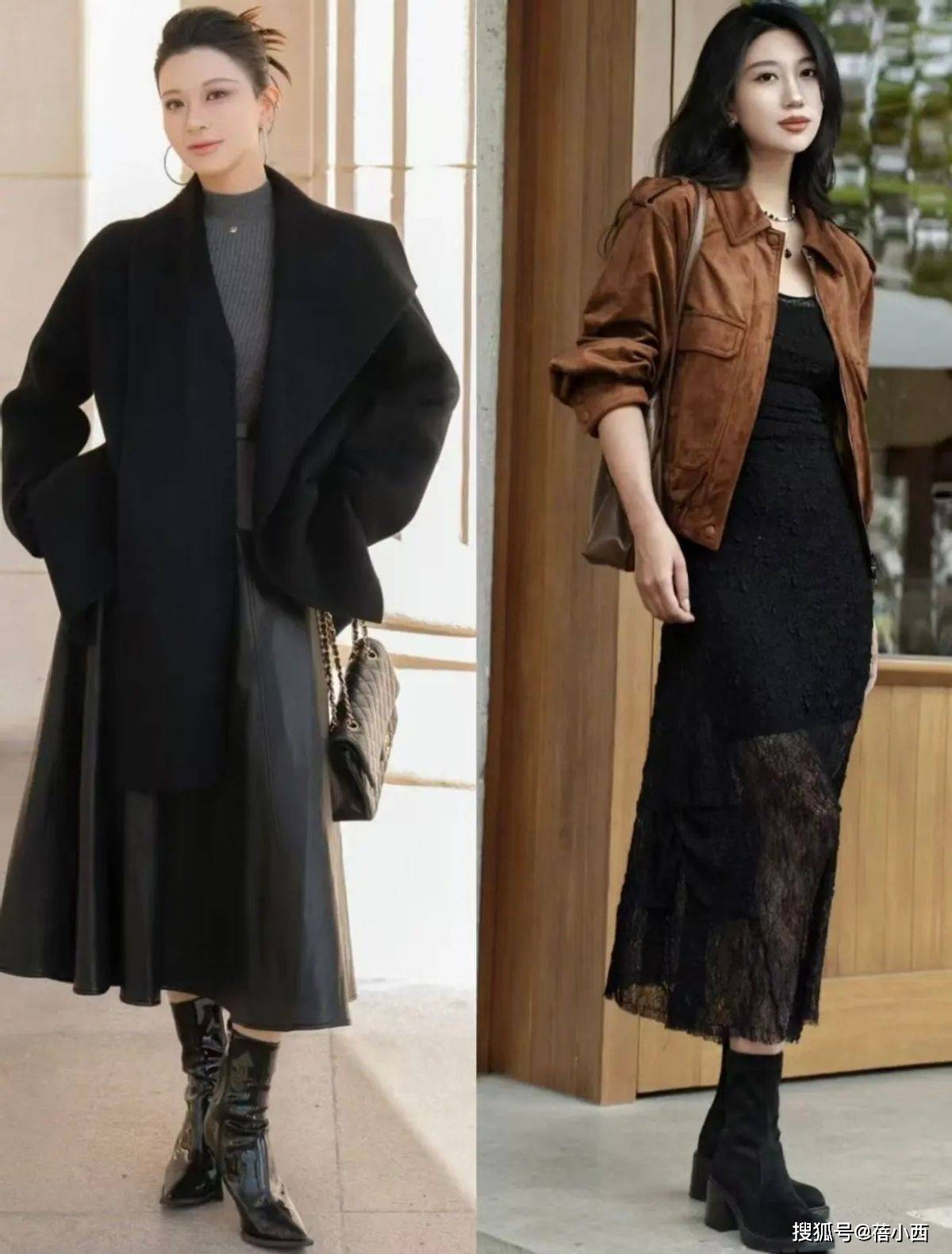 冬天穿裙子+靴子,外套选得好能让你的气场翻倍,如果你喜欢御姐风,姐妹们可以选毛呢西装和廓形大衣,长度到大腿中部或膝盖,敞开穿更提气质,下半身再搭配黑色长裙,衔接一双真皮的长筒靴,显得整个人端庄又大气。