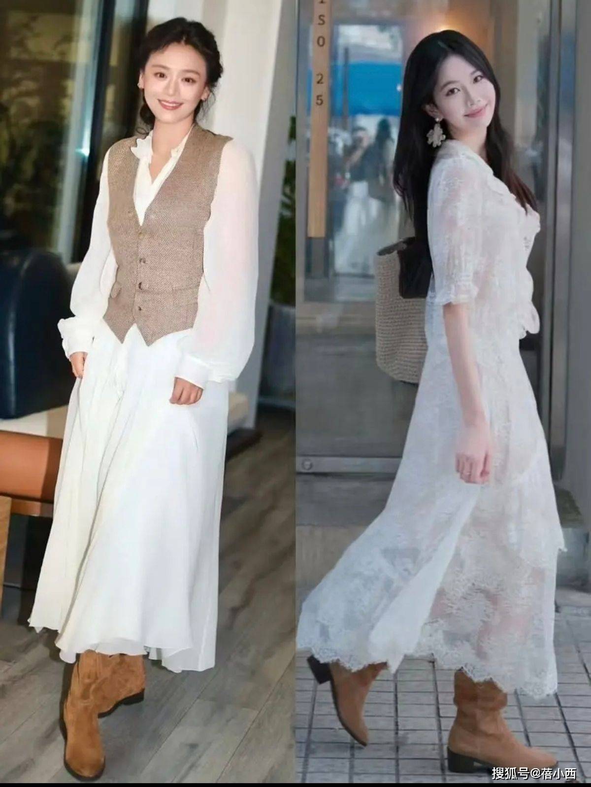 颜色搭配是穿搭的灵魂,“裙子+靴子”的组合,配色越简洁,越显高级,比如这种白色薄纱连衣裙,搭配卡其色长筒靴,可以减少搭配花哨感,浅色系的搭配也能凸显温柔的气质,让你在冬季赚足回头率,再也不怕变成路人甲了。