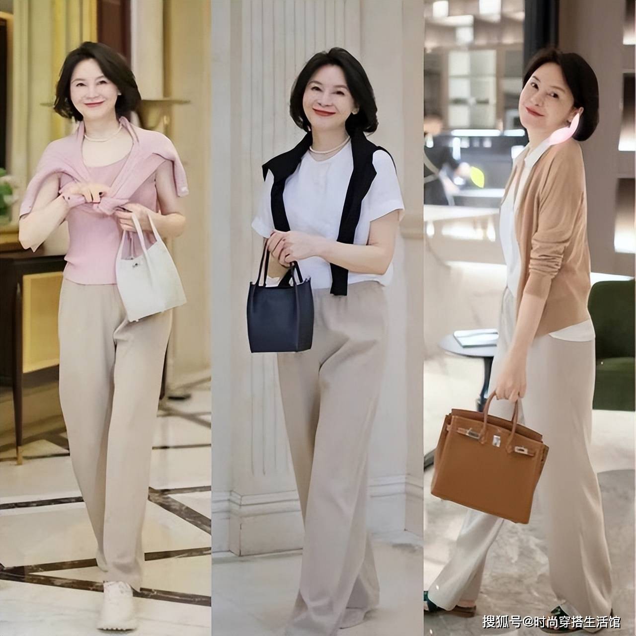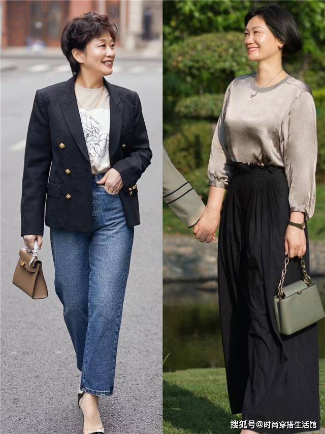 但同时要注意款式不能太老气,像翡翠或珍珠这些配饰有时候就很容易显老,在搭配时要根据场合挑选。平时穿衣的话,你就可以用一些时髦的包包做配饰修饰一下,让造型看上去更加休闲。