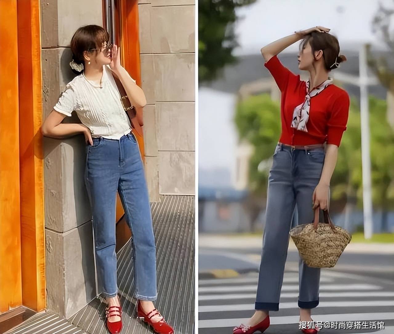 高腰剪裁的直筒牛仔裤是众多牛仔裤款式中最常见的之一,它的优势在于剪裁利落,会在穿搭者的腿部留有一定的空间,九五分的长度对任何身高的女性都非常的友好,丝毫不显拖沓,还会通过深色起到修饰腿部线条的作用。
