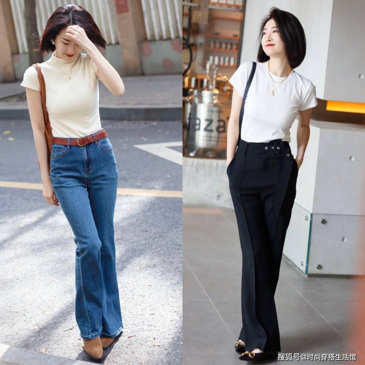 在T恤+长裤的搭配中,这一个雷区是最容易被人踩的。很多梨型姐妹都喜欢选择材质挺括的深色长裤,用于藏匿自己胯部和腿部的赘肉,此时,我们要不就露出脚踝线条,要不就尽量选择材质轻柔一点的裤子,比如雪纺阔腿裤。