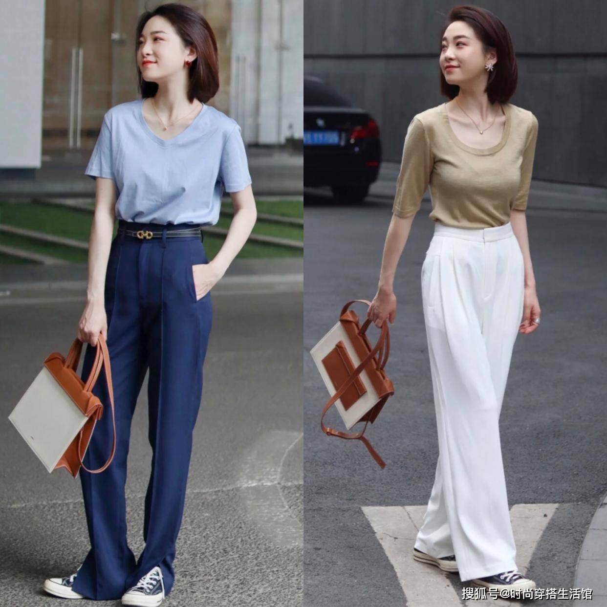 T恤配裤子绝对是夏天实用又舒服的最佳搭配,但如果只图简单,选择差不多的颜色和随便的穿法,很容易穿出图中这种老气、不精神的感觉。哪怕颜值气质都很好,也会因为穿搭没有重点、过分松懈给人邋遢无聊的感觉,如果身材本身微胖还会更加显胖显矮,是避雷的重点。