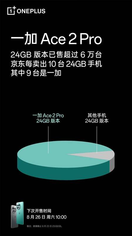 一加Ace 2 Pro无疑是今年8月份的明星产品,同时它也是大内存赛道的引领者。据@一加手机称,在公开可查询数据的京东平台,每卖出10台24GB手机,其中9台是一加。(数据截止8月23日23:59:59)