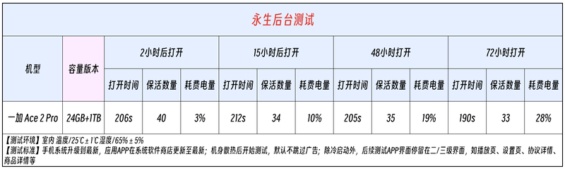 同时我们也测试了其“永生后台”,测试结果显示,在72小时后一加Ace 2 Pro保活数量为33个,虽不及官方宣传的41个,但是相较于其他友商,这个保活数量已经是顶尖水平了,十分强大。