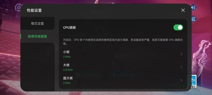 当在极客性能面板中用户自定义最高CPU频率3.2GHz时,为了用户的自身安全,防止设备发热严重造成什么不良的后果,真我GT5还设置了当设备发热严重时系统自动接管CPU调频功能的安全功能,十分贴心。