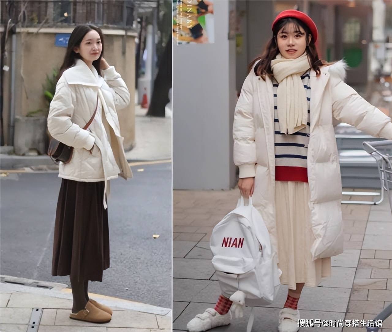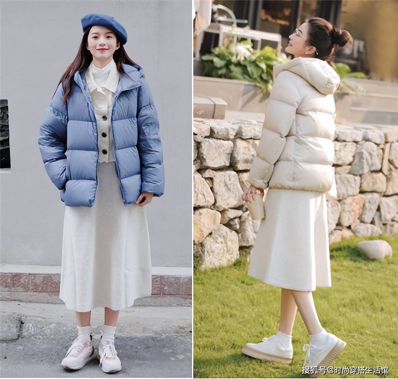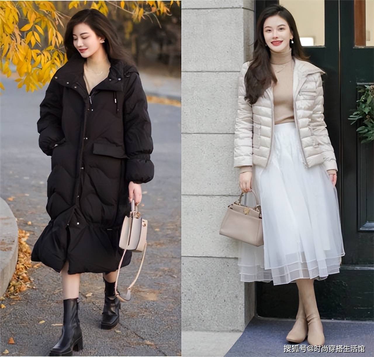 比如上半身如果穿的羽绒服很宽松,下半身搭配的裙子不会太过宽大,都会尽可能选择a字版型,从而和羽绒服形成版型上的对比。