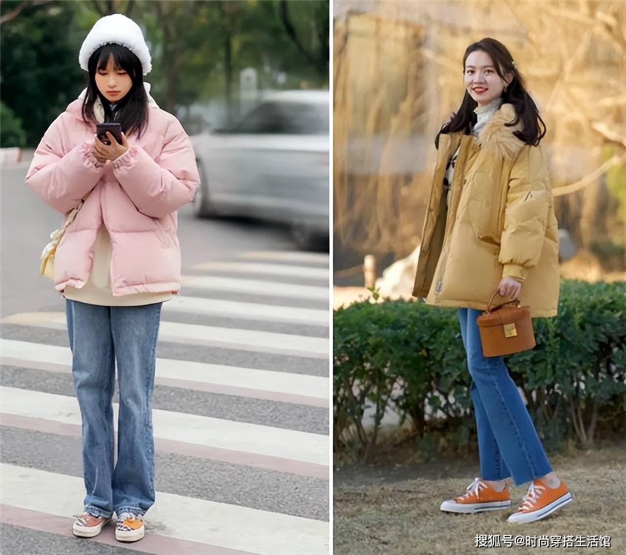 建议搭配白色、米色、浅粉色等饱和度高、明亮度高的亮色系羽绒服,既可以借助羽绒服与牛仔裤的明暗变化,提升整个造型的吸睛,也可以无形中增加造型层次感。