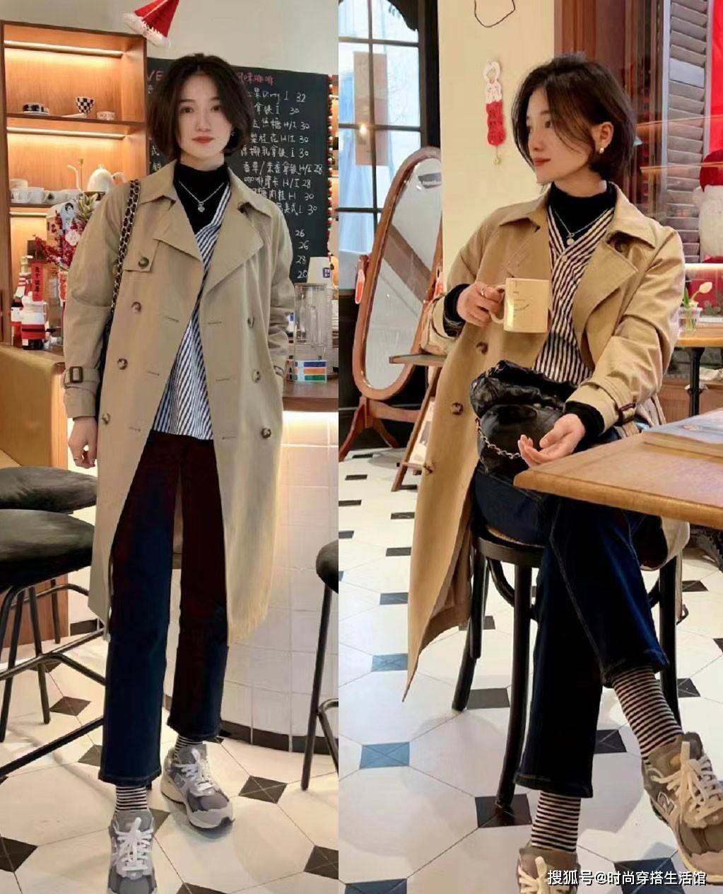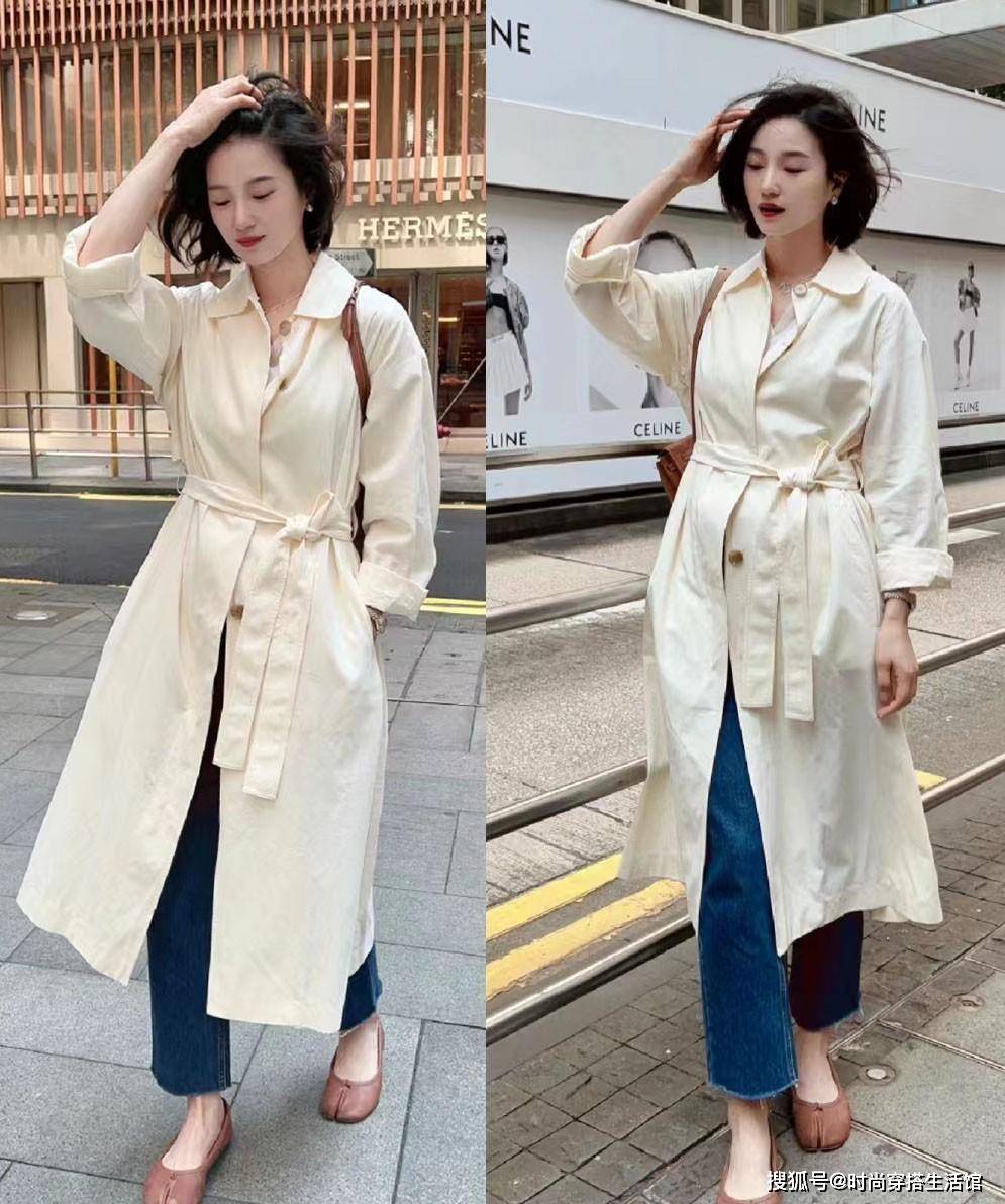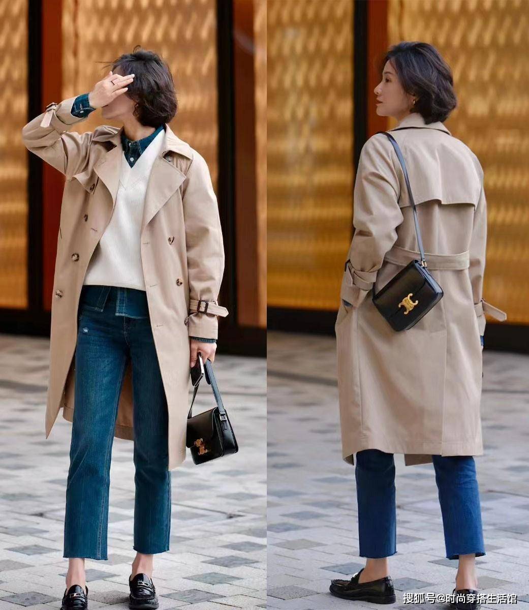 而如果是膝盖以上的中长款风衣的话,那么体现腿型的比例与气质的利落感呈现就比较重要,建议大家多多与之搭配九分长度的直筒裤,露出来脚踝的部分做为28分的比例分割哦!
