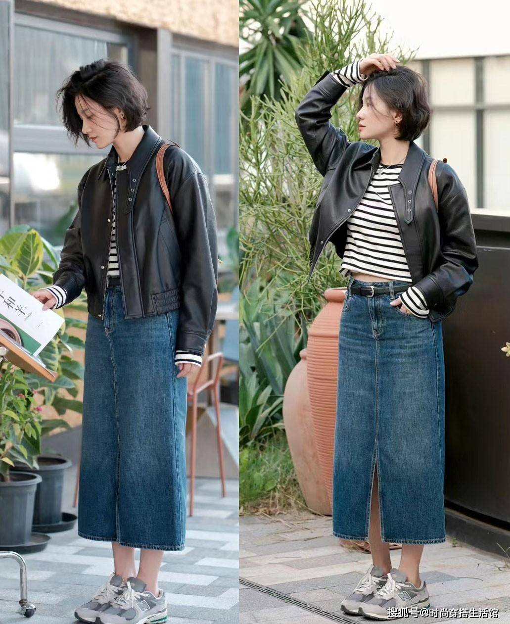 无论女性的个子够不够高,短外套都是让人驾驭起来没有压力的,不会在视觉上产生压身高的风险。像图中这件黑色皮衣,短款的样式更增添了轮廓的立体感,可以使上身线条看起来更挺廓有型,令人穿出格外帅气高挑的身姿。