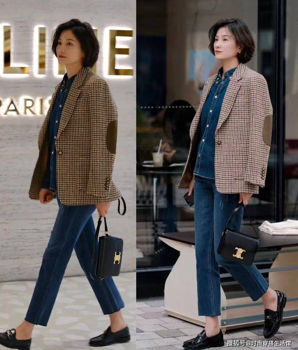 look2.格纹西装+牛仔裤