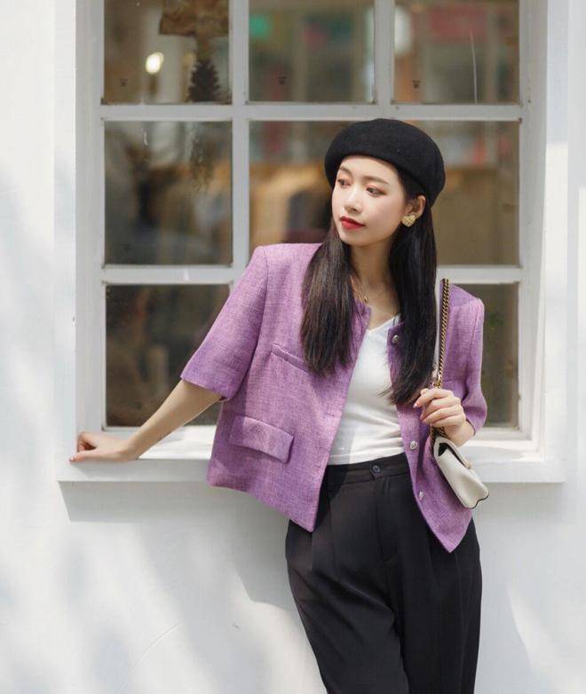 比如像这位时尚博主的穿搭,用一件浅紫色的小外套,内搭一件白色T恤,下半身是一款直筒设计的西装裤,在搭配上一款黑色的贝雷帽和时尚小包包,显得也不的洋气。
