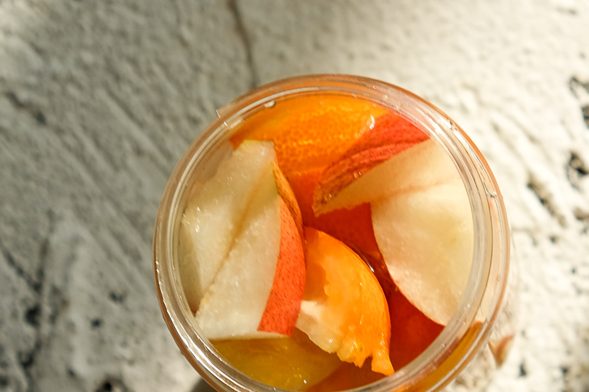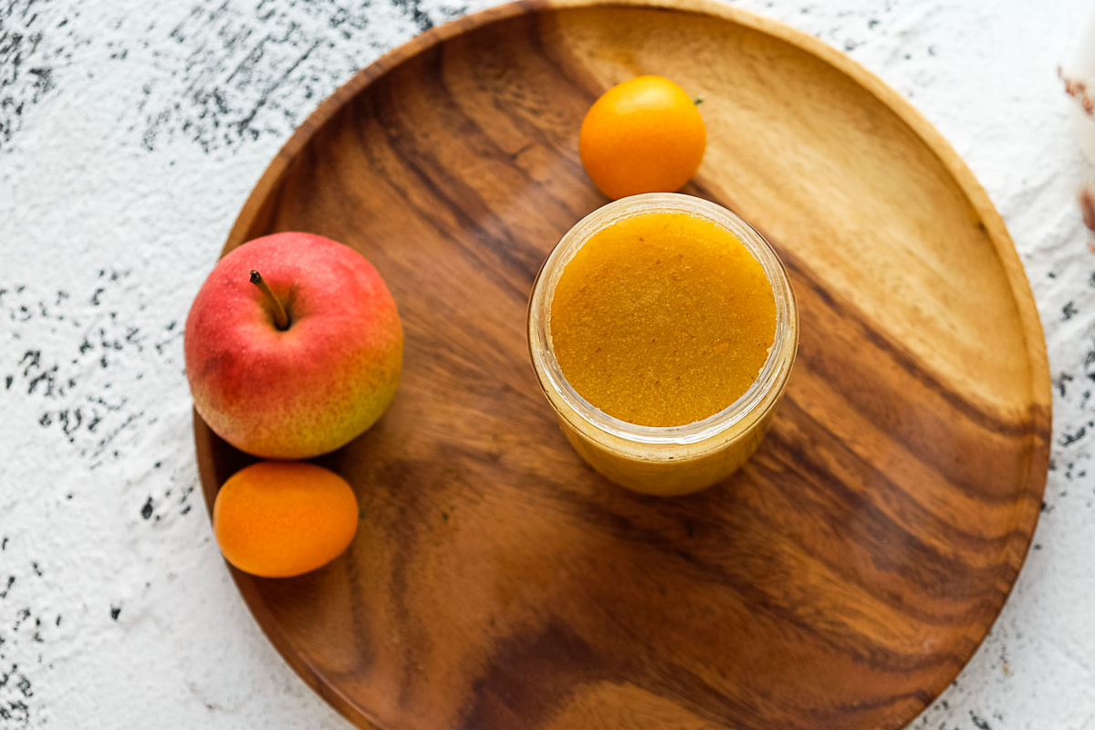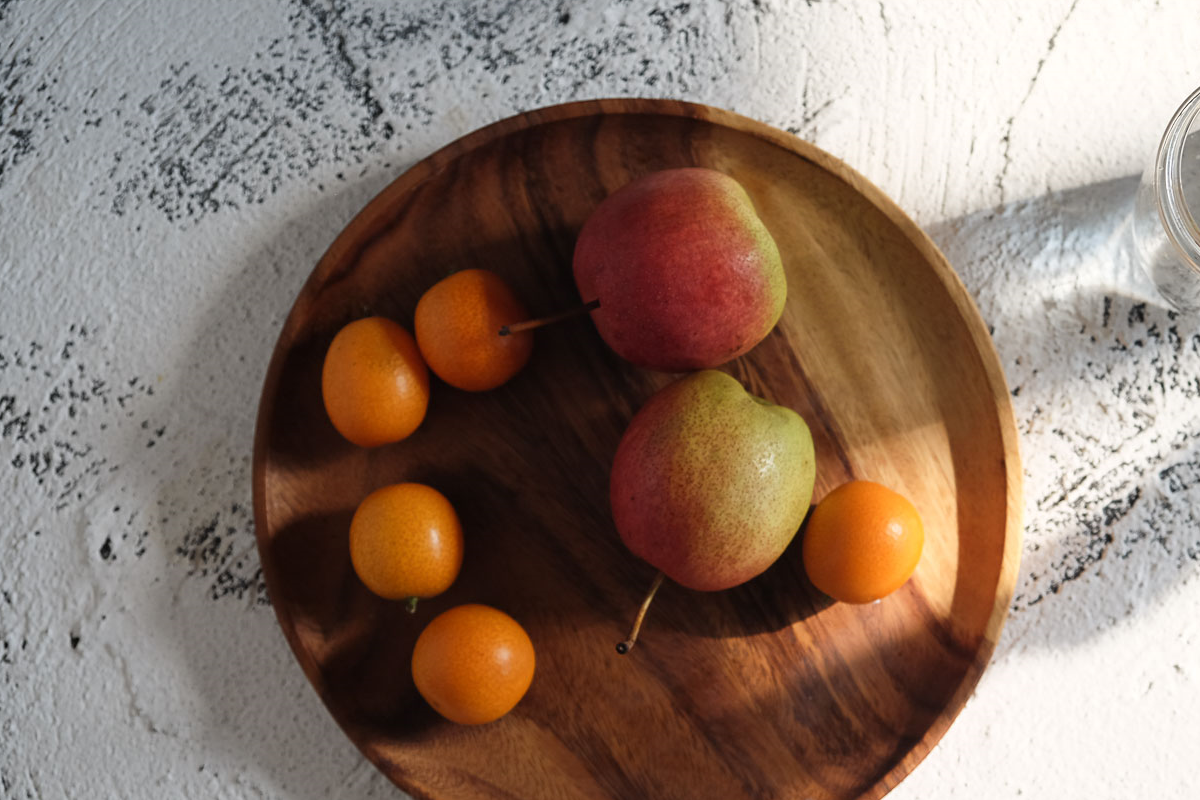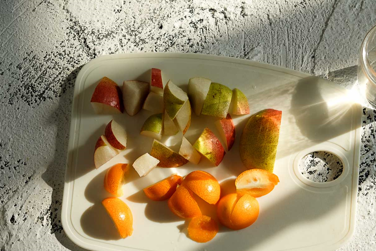1红肖梨、金桔洗干净,切成小块,金桔里面的小籽可以去掉。
