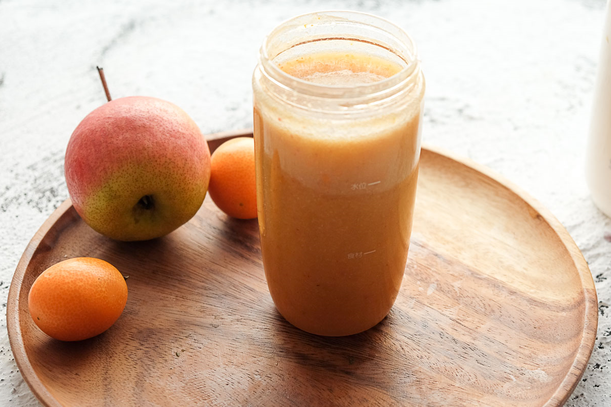 2然后将金桔,红肖梨,和水放入到果汁杯里。