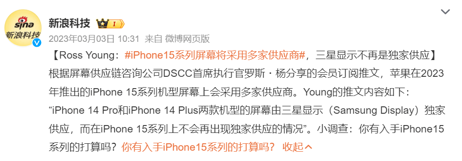 相较于华为小米,“屏幕混用”策略使用得最彻底的,还得是手机行业的龙头大哥——苹果。早在LCD屏幕年代,iPhone就已经开始玩“屏幕混用”这一套了,一款机型可以同时提供夏普、JDI、LG等等供应商的屏幕;iPhone13系列则是混入了三星、LG两家厂商的5款屏幕,而且屏幕素质还有所差别;而去年发布的iPhone15系列,也因为被曝“屏幕混用”登上了微博热搜。