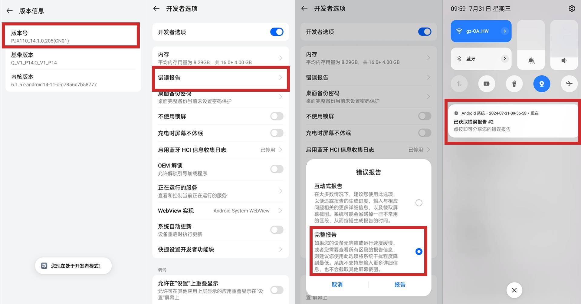 而更加精确的结果也可以在开发者选项中获取,以黑厂系(OPPO、一加、真我)手机为例,通过多次点按设置中的“版本号”触发“开发者选项”,在“开发者选项”中点击“错误报告”选择“完整报告”获取手机详细信息,等待几分钟后即可在下拉菜单中收到详细报告,