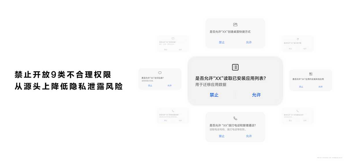 而HarmonyOS NEXT全面梳理了所有系统授权,禁止开放了9类不合理权限,包括:读取已安装应用列表、访问短信、访问存储文件、创建桌面快捷方式、获取设备信息、显示悬浮窗、访问通话记录、应用内安装应用、拨打电话和管理通话,不仅降低了用户的管理成本,还从根源上避免用户隐私泄露。