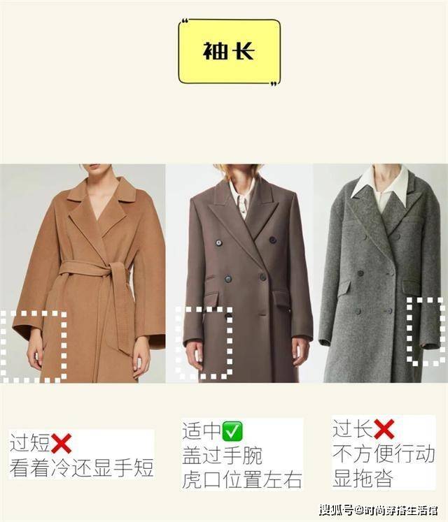 然后要看袖子长度。最显气质的毛呢大衣袖长应该是刚好盖过手腕,在虎口位置左右的长度。如果想要让毛呢大衣穿起来更显高,选择在身体两侧或衣服后侧增加到v型开叉设计是很好的选择。