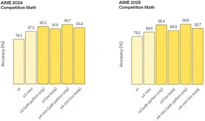 在性能方面,o3是OpenAI目前最强大的推理模型,它在编码、数学、科学、视觉感知等领域号称处于前沿。o4-mini则更小、更高效,专为快速和成本效益高的推理任务设计。在基准测试中,o3和o4-mini在数学、编码和视觉任务上表现优异。