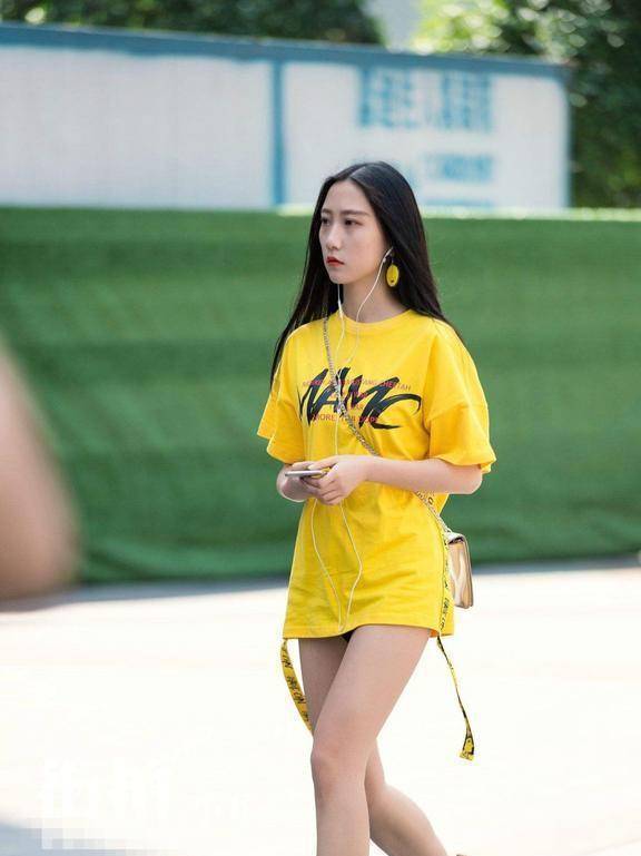 对于在搭配上比较懒的女生来说,想把短裙穿出美感也并非难事,只要选对款式就行了,T恤短裙就是很值得推荐的,一件就能轻松搞定,简单省事既符合自己的搭配习惯又能穿出美感,就像这位美女一样,一件深黄色的大号T恤就轻轻松松穿出了迷人的气质。