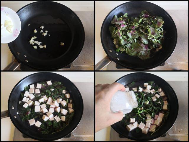 制作过程: 将豆腐切成小块备用; 将蒜切成细末备用。 烧热锅放入少许油, 加入少许蒜末放进锅中煸炒香, 加入洗净的苋菜放进锅中翻炒几下, 加入适量的水炖煮,加入豆腐块放进锅中去煮上3分钟, 再加入少许盐调味即可。