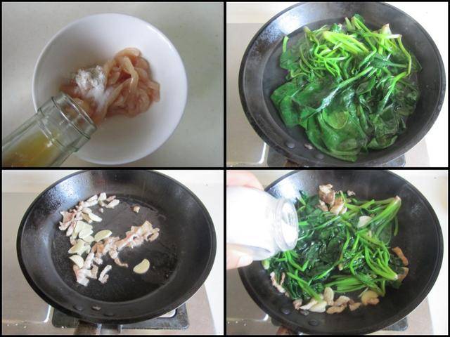 制作过程: 将里脊肉切成细丝, 加入少许盐、淀粉、生抽和料酒等调味料拌均匀腌制3分钟入味; 烧锅开水,加入少许盐和几滴油,将洗净的菠菜放进锅中焯烫变色后捞出,这样能去除菠菜所含的草酸。 烧热锅放入少许蒜丝放进锅中煸炒香,加入腌制好的肉丝进锅翻炒至变色,加入焯好的菠菜放进锅中翻炒几下,加入少许盐调味,翻炒均匀即可。