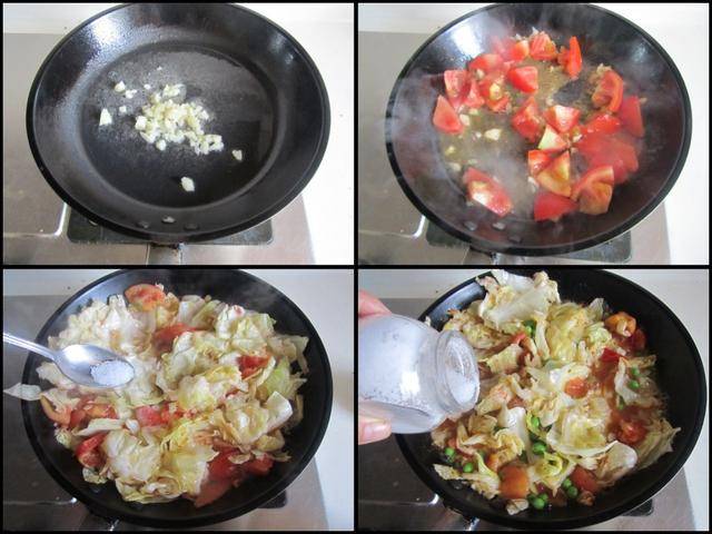 制作过程: 将卷心菜手撕成片,这样更利于卷心菜吸收味道; 将番茄切成小块备用, 将蒜切成细末备用; 烧热锅放入适量的油,加入少许蒜末放进锅中煸炒香,加入准备好的番茄块放进锅中翻炒至微微出汁,这样用油煸炒过的番茄更利于番茄红素的吸收,加入洗净的手撕卷心菜叶放进锅中翻炒几下,加入1勺糖来提鲜, 再加入1把豌豆放进锅中翻炒几下,最后加入少许盐调味, 翻炒均匀即可。