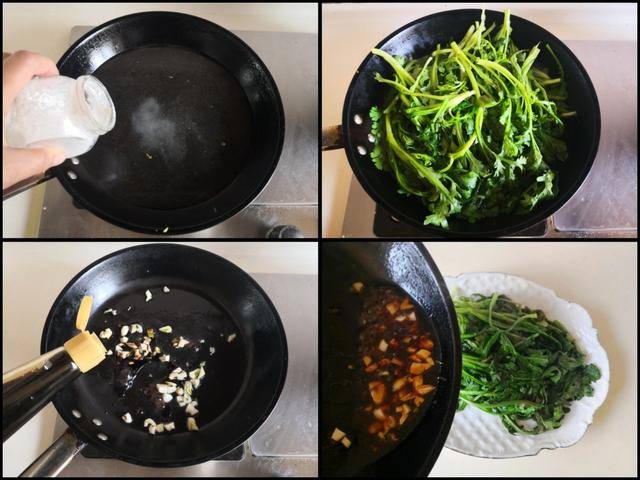 制作过程:将摘好的茼蒿洗净备用; 将蒜切成细末备用。 烧锅水加入少许盐和几滴油,将洗净的茼蒿放进锅中焯煮熟后捞出放在盘中,焯蔬菜时加入盐和油能保持蔬菜翠绿的色泽。 烧热锅放入少许油,将蒜末放进锅中煸炒香,加入生抽和蚝油和少许水焖煮2分钟后收汁, 再将准备好的蒜蓉蚝油汁浇淋在焯熟的茼蒿上,吃时拌均匀即可。
