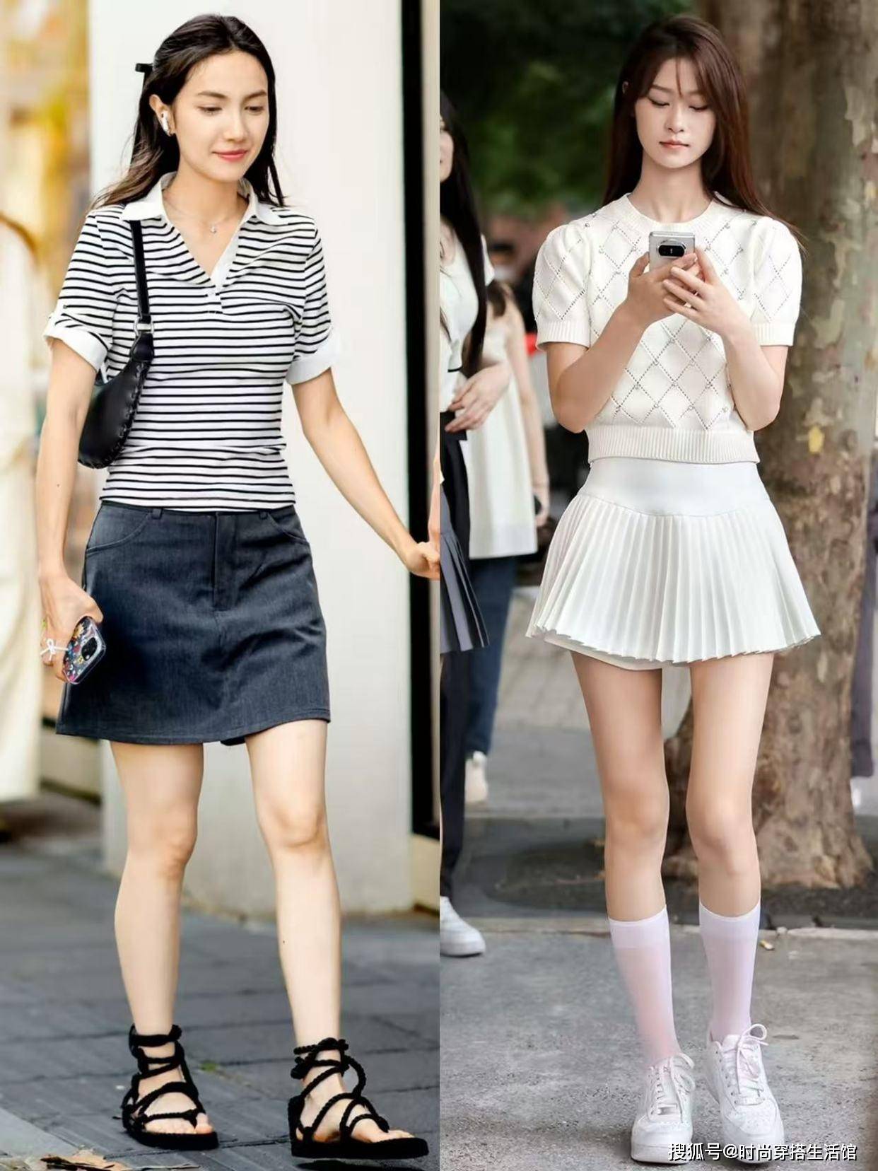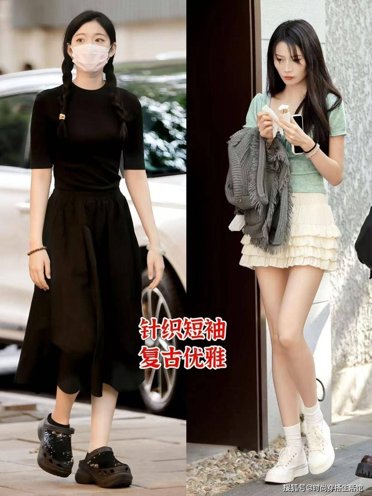 短袖针织衫到如今这个天气依然很实用。毕竟针织质地只有薄薄的一层,并不会让人感觉到闷热,反而会带来很清新透气的体验,与V领结合后,还能露出你精致纤细的锁骨。下装可以搭配A字半身裙来强化女人味,它呈现“上紧下松”的设计,有种自然的递进美。