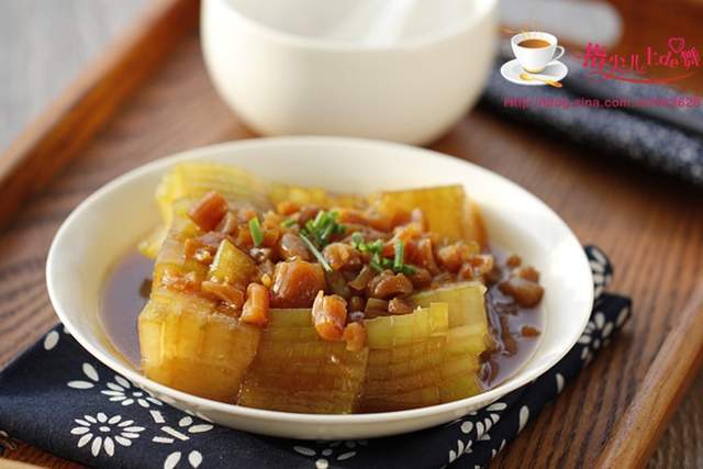 推荐菜品【干贝烧冬瓜】原料: 冬瓜 1块 干贝 1把 生抽 1勺 蚝油 1勺 葱花 少许 油盐 少许