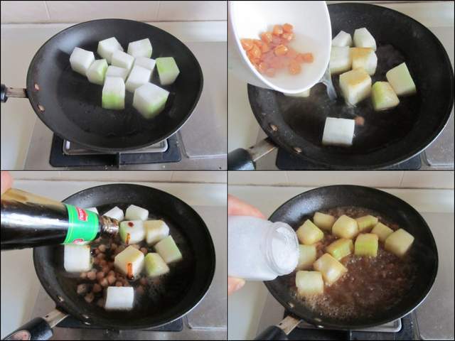 制作过程:将冬瓜去皮后切成小方块, 再在冬瓜表皮打上十字花刀; 烧热锅放入适量的油, 将准备好的虎皮冬瓜块放进锅中翻炒几下, 再加入泡过的干贝和泡干贝的水,加入少许生抽和蚝油翻炒均匀, 炖煮五分钟将其炖煮熟后加入少许盐和胡椒粉调味,大火收汁后盛入盘中, 撒上少许葱花即可。