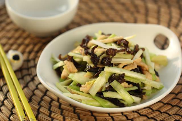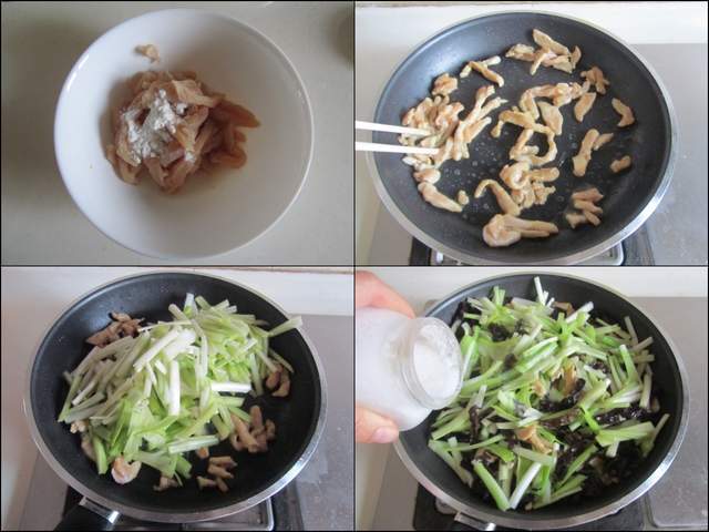 【韭黄木耳炒鸡丝】 原料: 韭黄 1把 黑木耳 1小把 鸡脯肉 1小块 生抽 1勺 料酒 1勺 淀粉 1小勺 油盐 少许
