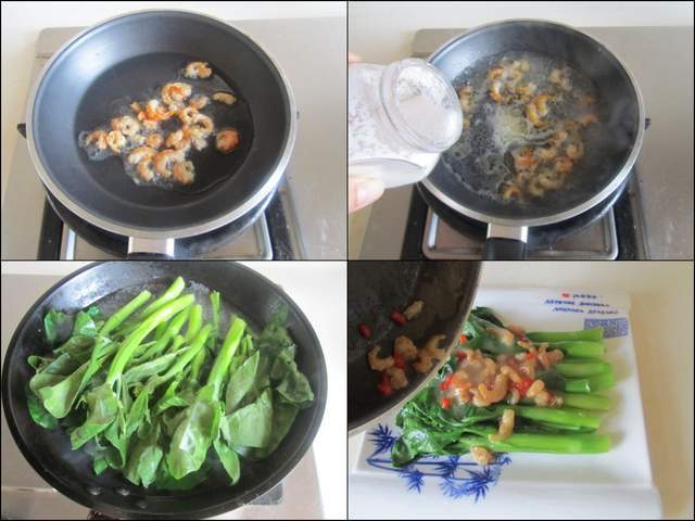 制作过程: 提前将干虾仁清洗干净后用冷水泡上5分钟; 烧热锅放入少许油,将泡过的干虾仁放进锅中煸炒几下,加入泡虾仁的水炖煮3分钟,加入少许盐调味,放入枸杞, 再加入少许水淀粉勾芡即可。 烧锅水加入少许盐和几滴油,将芥兰放进锅中焯煮熟后捞出摆放在盘中, 焯蔬菜时加入盐和油能保持蔬菜翠绿的色泽和爽脆的口感。 将焯熟的芥兰摆放在盘中,将制作虾仁芡汁浇淋在蔬菜上。