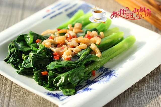推荐菜品【虾仁芥兰】 原料: 芥兰 1把 干虾仁 1把 枸杞 少许 料酒1勺 水淀粉 少许 油盐少许