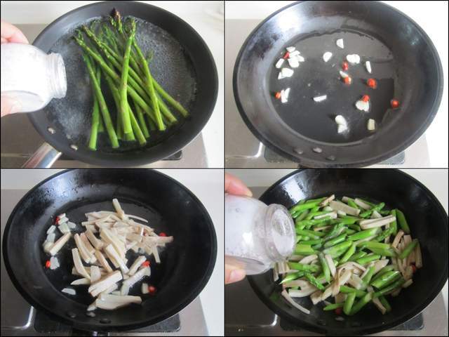 制作过程:先将杏鲍菇切成条备用。 烧锅水加入少许盐和几滴油,将整根芦笋放进锅中焯烫变色后捞出切成小段备用; 整根芦笋焯水能避免营养的流失; 烧热锅放入适量的油,加入少许蒜末和红椒圈放进锅中煸炒香,加入准备好的杏鲍菇条放进锅中翻炒几下,加入焯好的芦笋放进锅中翻炒几下,加入少许盐调味,翻炒均匀即可。