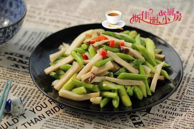 推荐菜品【芦笋炒杏鲍菇】 原料: 芦笋 1把 杏鲍菇 1根 蒜 3瓣 红椒 1个 油盐 少许
