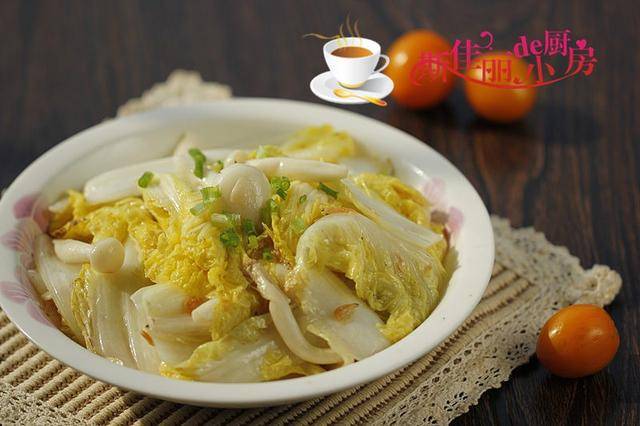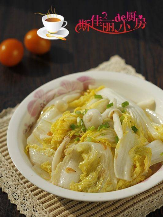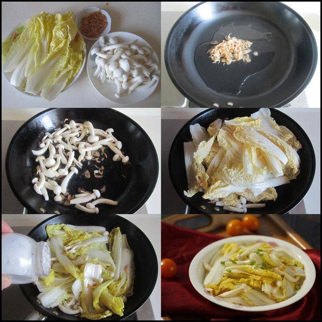原料: 虾皮 1把 娃娃菜 1颗 白玉菇 1小盒 油盐 少许