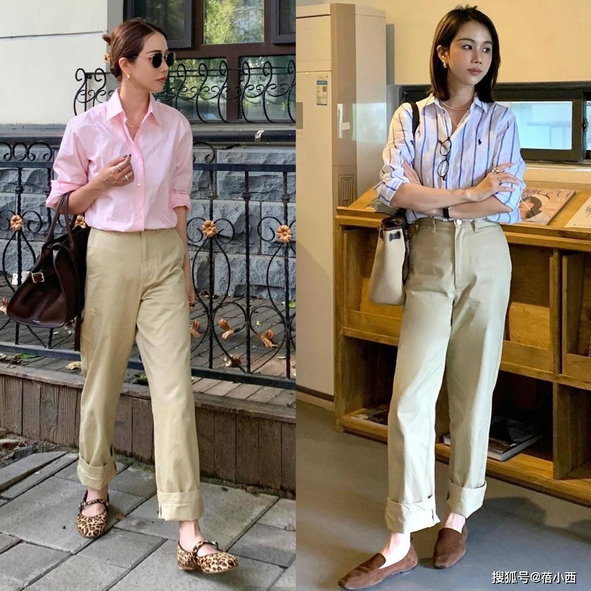 卡其色称得上非常万能的色彩,如果你有一条卡其色的裤子,可以用来搭配基础款的白衬衫,这种造型利落简约,整体色不过三,看起来还是很时髦的。