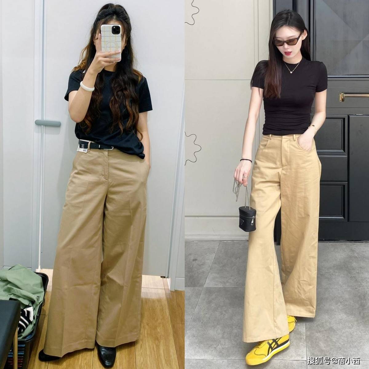 黑色t恤搭配卡其色阔腿裤,也带来了浓郁的复古感,黑色短袖显瘦还百搭,卡其色阔腿裤复古知性,整套简洁的基础款搭配能提升你的气场,轻松演绎不费力的时尚感。