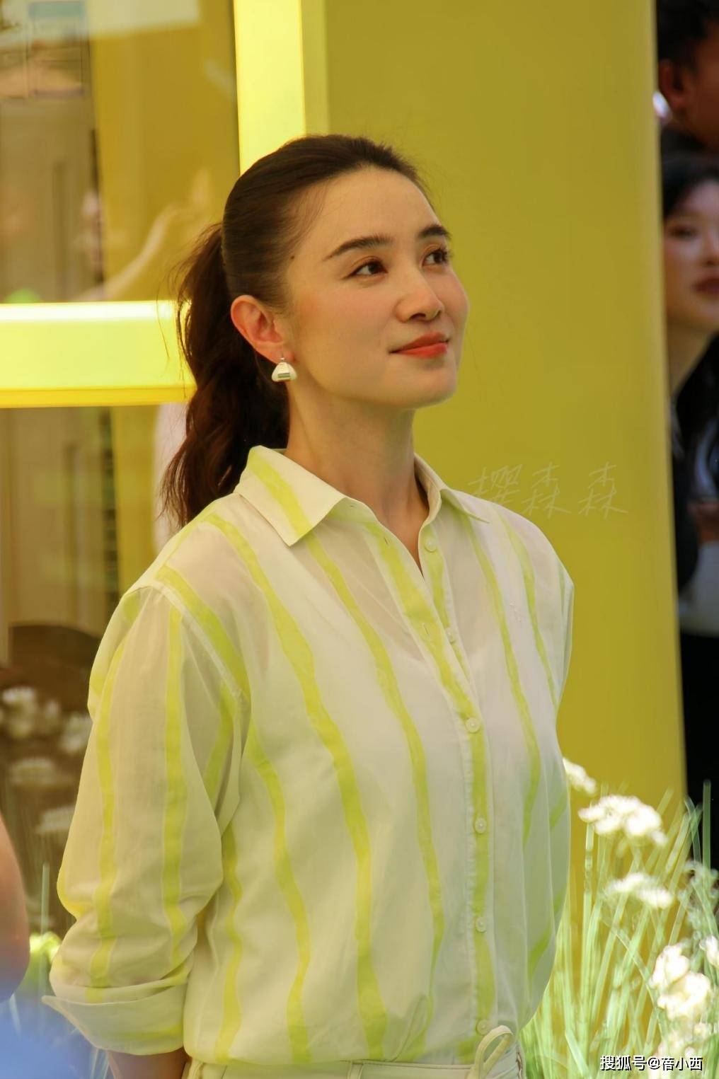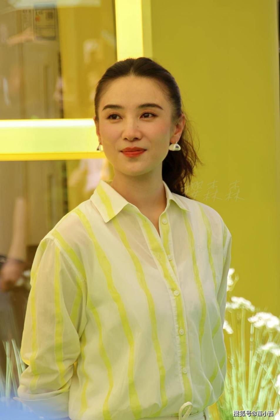身上这件衬衫是条纹款,关键是竖型的,不管是领口还是袖子、胸前都清晰可见。
