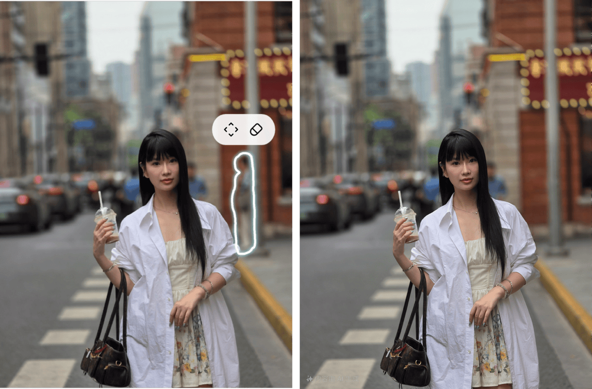 面对照片中乱入的路人或杂物,用户只需用手指轻松圈选,Galaxy AI便能智能识别并移除,同时利用先进的生成技术,以几乎天衣无缝的方式填补背景,让修改后的照片看起来浑然天成。
