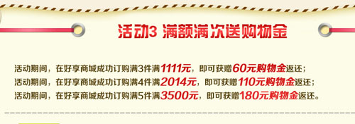 1、丁丁打折网(www.dddazhe.cn)发布的好享商城优惠券,好享商城满3500减180元优惠券全场通用。2、此优惠券为促销券,点击下面的图片直接进入优惠券领取页面。