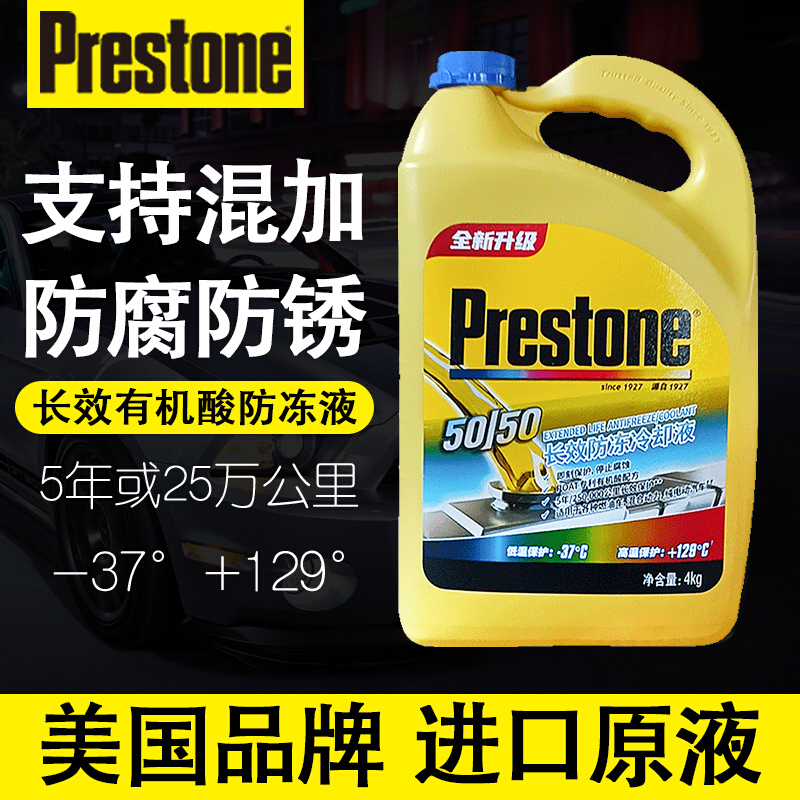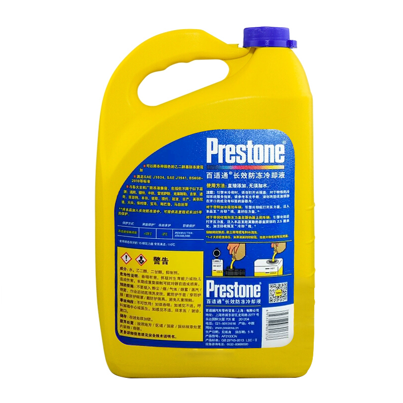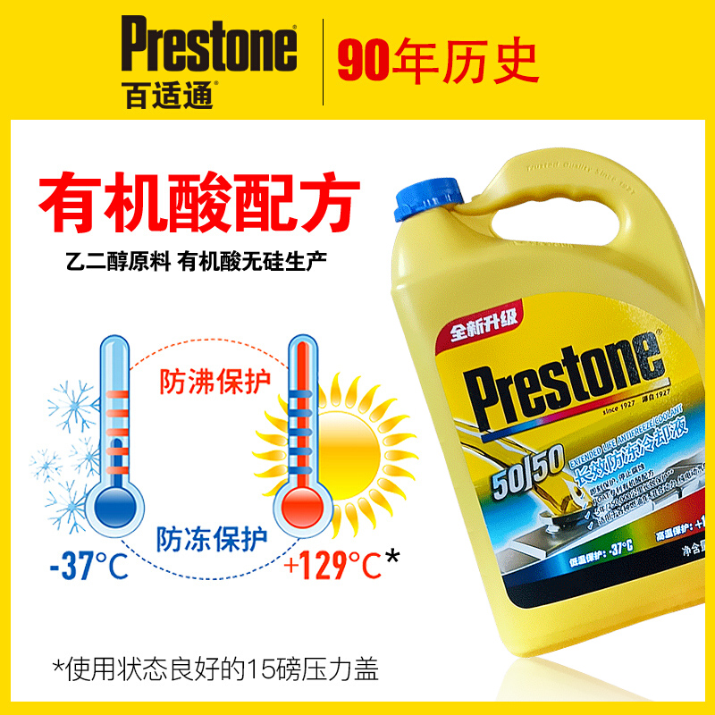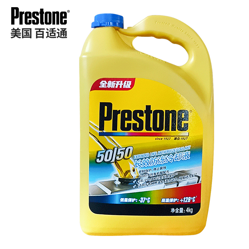 Prestone百适通是美国Honeywell霍尼韦尔旗下的汽车用品品牌。这款百适通50/50预混合长效防冻液,是百适通的旗舰系列产品,采用50%特质防冻液/冷却液和50%软化水(传热保护)混合而成,特殊的化学组分和配方技术,不含磷酸盐,硼酸盐和硅酸盐等,既延长了腐蚀抑制剂的寿命,又能为铝质和其它冷却系统金属部件提供长效保护。即用型配方即开即用,添加前不需清除原有防冻液和水,与任何类型或型号的汽车的任何防冻液兼容。容量3.78L。提供5年或25万公里保护,冰点-37℃,沸点129℃,适合国内大部分地区。