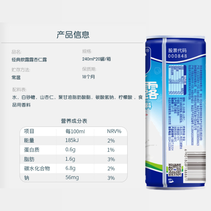 露露(lolo)的这款杏仁露,配料选用水、白砂糖、山杏仁等。给杏仁脱皮以弱化其苦味,再采用石磨研磨的方式,保留杏仁中的营养成分。入口清爽顺滑,鲜美醇厚。易拉罐装,密封性好,方便携带,即开即饮。保质期18个月,建议置于阴凉干燥处储存。