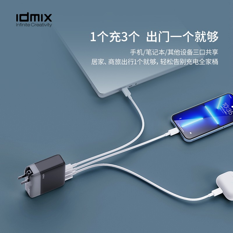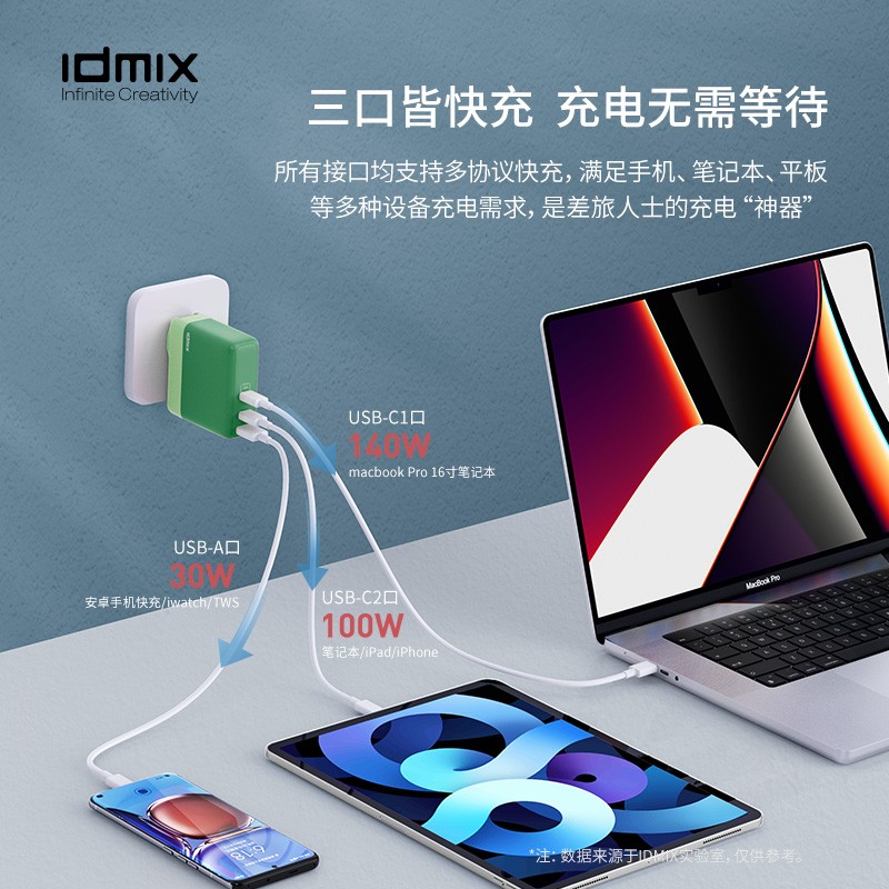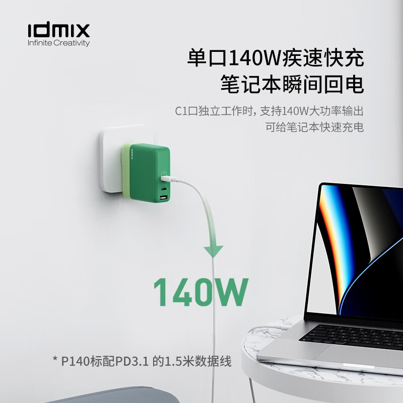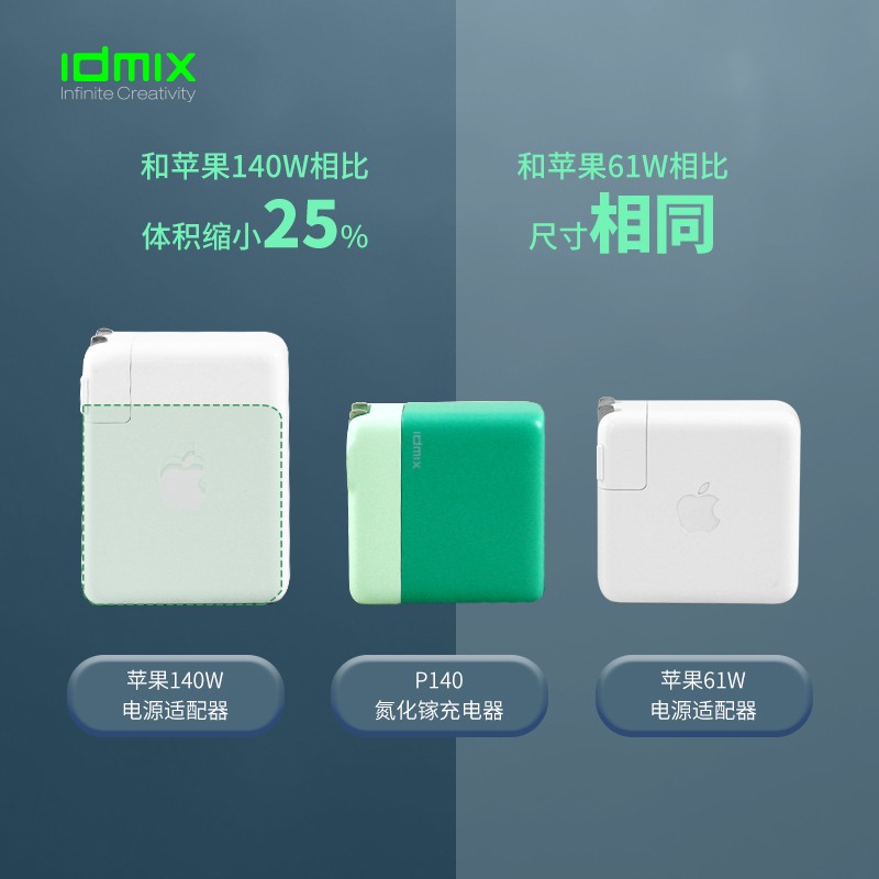 IDMIX P140采用纳威氮化镓器件+碳化硅两种第三代半导体材料,大幅提升导热效率,通电性能和散热性能,降低充电器的散热需求,同时更具备更高频率,更小体积等优势。P140体积相比苹果140W电源适配器缩小25%,相当于苹果61W电源适配器的体积大小。C1口独立工作时,支持140W大功率输出可给笔记本快速充电。所有接口均支持多协议快充,满足手机、笔记本、平板 等多种设备充电需求,是差旅人士的充电“神器”。可折叠插脚,轻松放进随身小包,充电器重量为268g。