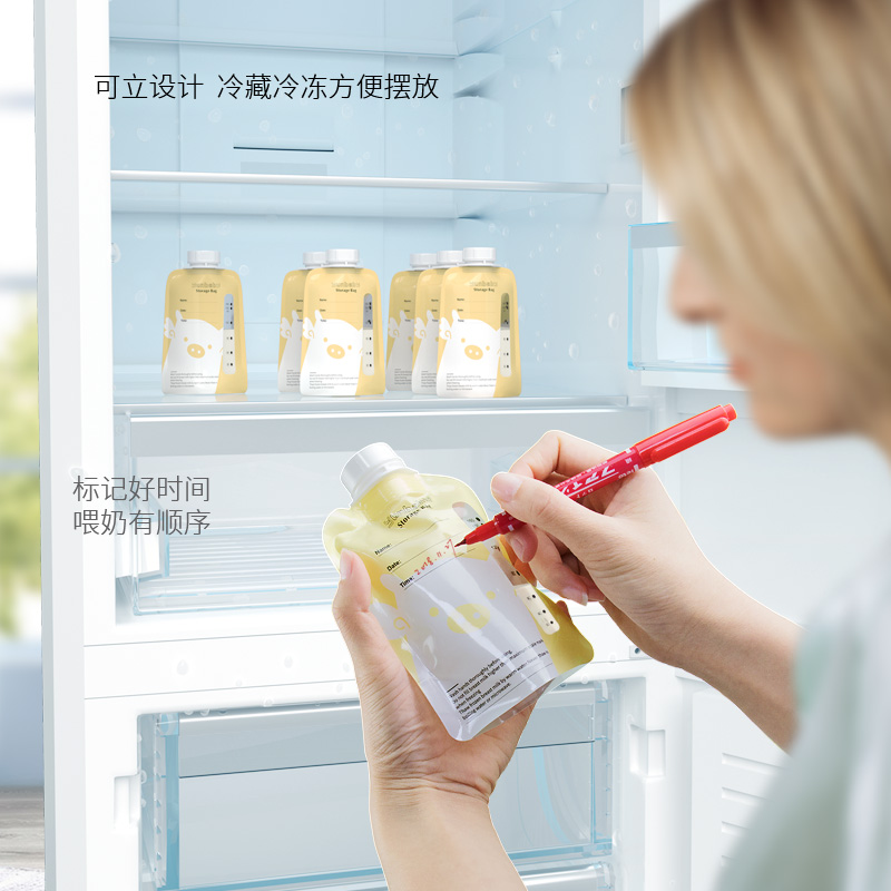孕贝(yunbaby)推出的这款母乳存储袋套装,内含母乳储存袋和转接口。母乳储存袋外、中、内层分别为尼龙、环保丝印和PE材质。采用螺旋密封口设计,可以隔绝细菌,避免污染。袋子底部的可立设计,方便摆放。