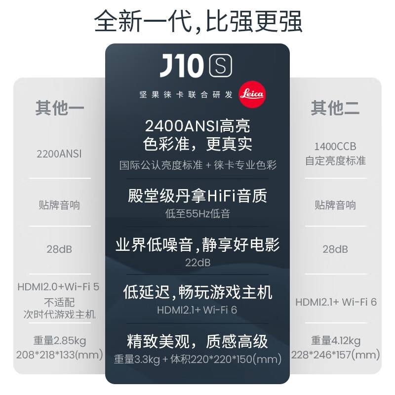 坚果 J10S 投影仪家用投影机 游戏投影 家庭影院 性能怪兽(2400ANSI 徕卡色彩 丹拿调音 WiFi6 HDMI2.1)
