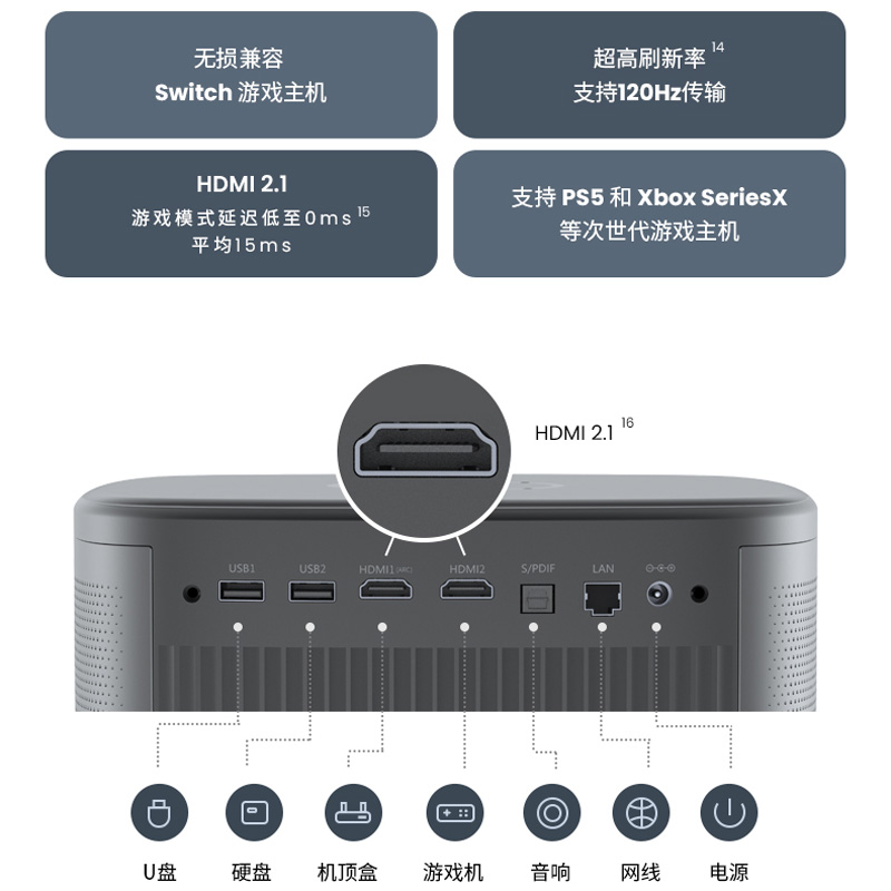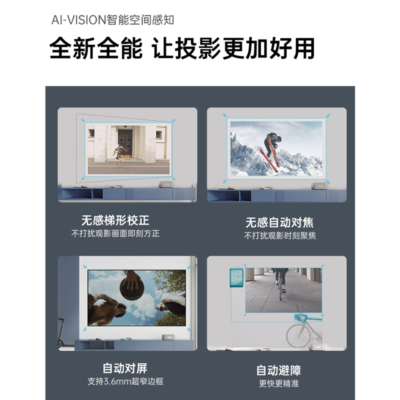 在功能方面,坚果J10S支持无感梯形校正,无辅助图像打扰就能得到方正画面,观影不出戏,对比上一代,更低的校正误差,更高的灵敏度。画面自动避障设计,通过对投影墙面的扫描,自动找到最大可投影范围对比上一代,更精准的环境扫描和更快的运算速度。 该机具备自动对屏,通过对屏幕或幕布的扫描,精准对齐边缘,对比上一代,有更快的扫描和运算速度,支持3.6mm超窄边框的长焦抗光屏。高效适配Wi-Fi6+DMI2.1功能,全局加速,畅享体验。